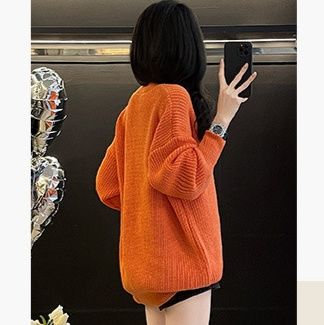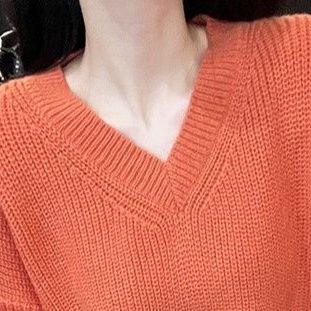 深めのブイネックデザインがすっきりとした印象を演出し、リブ編みの袖が立体的なアクセントになっています。